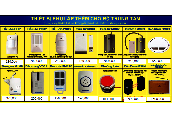 - Trọn bộ bao gồm : Bộ điều khiển trung tâm, 1 đầu báo trộm lắp tường, 1 đầu báo trộm lắp cửa, 1 còi có dây, 2 điều khiển từ xa, 1 Adaptor nguồn