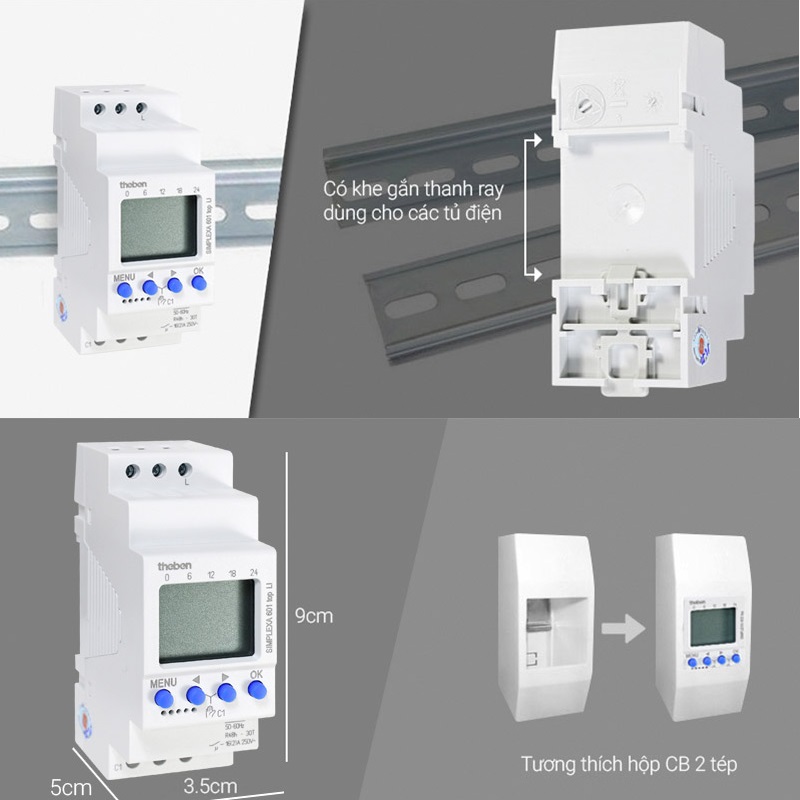 Công tắc thời gian SIMPLEXA 601 Top Li (Pin Lithium) được thiết kế gắn rail rất thuận tiện để lắp lên tủ điện, hộp âm tường thiết bị được nối vào terminal của timer.