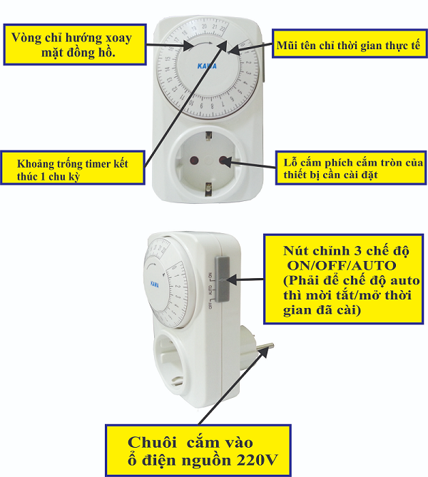 Dùng để cài đặt thời gian mở/ tắt thiết bị như: máy tính , sạc điện thoại, Máy nước nóng lạnh, Nồi cơm điện, Wifi, ADSL internet....