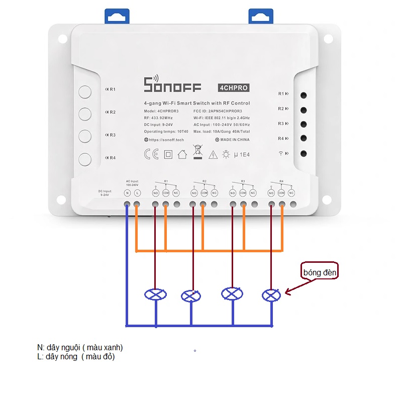 Cách sử dụng: Đấu nối với thiết bị điện bạn muốn điều khiển đúng ngõ vào, ngõ ra như trên hình